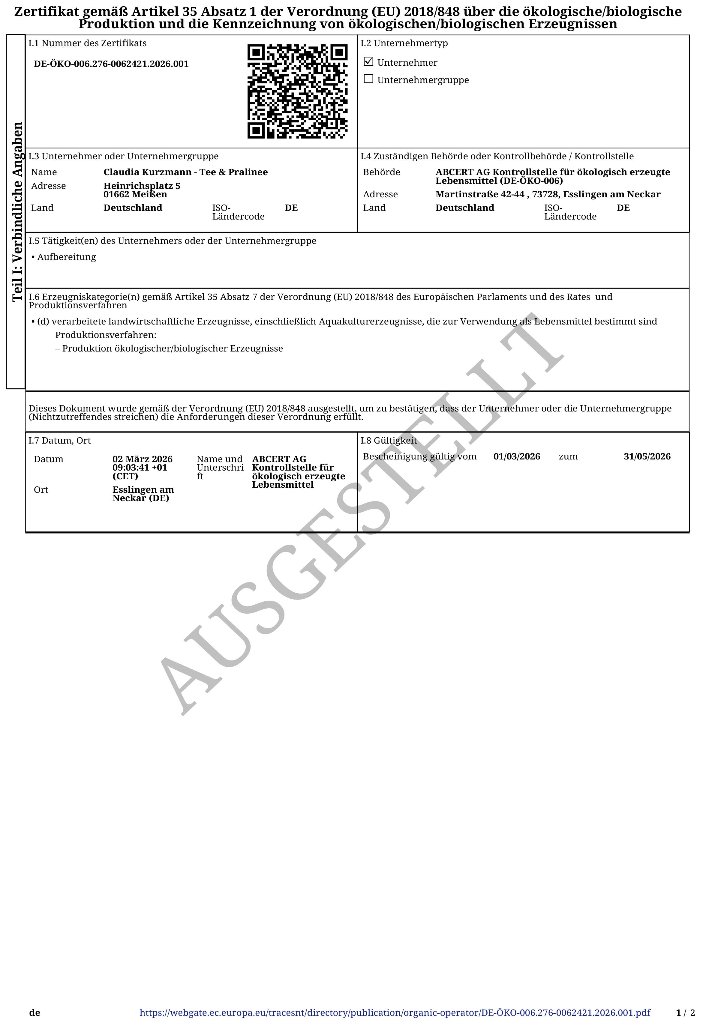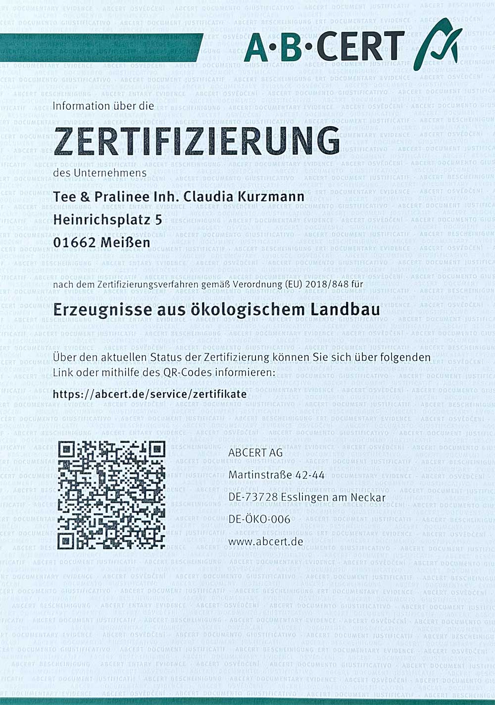 Unser aktuelles Bio-Zertifikat: